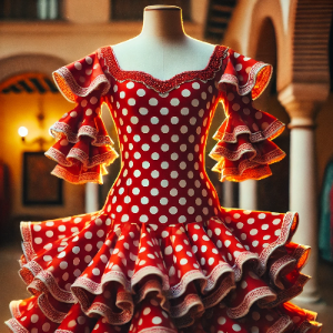 플라멩코 춤을 출 때 착용하는 의상으로, 몸에 꼭 맞는 실루엣과 풍성한 프릴이 특징.